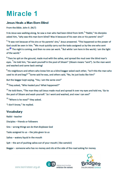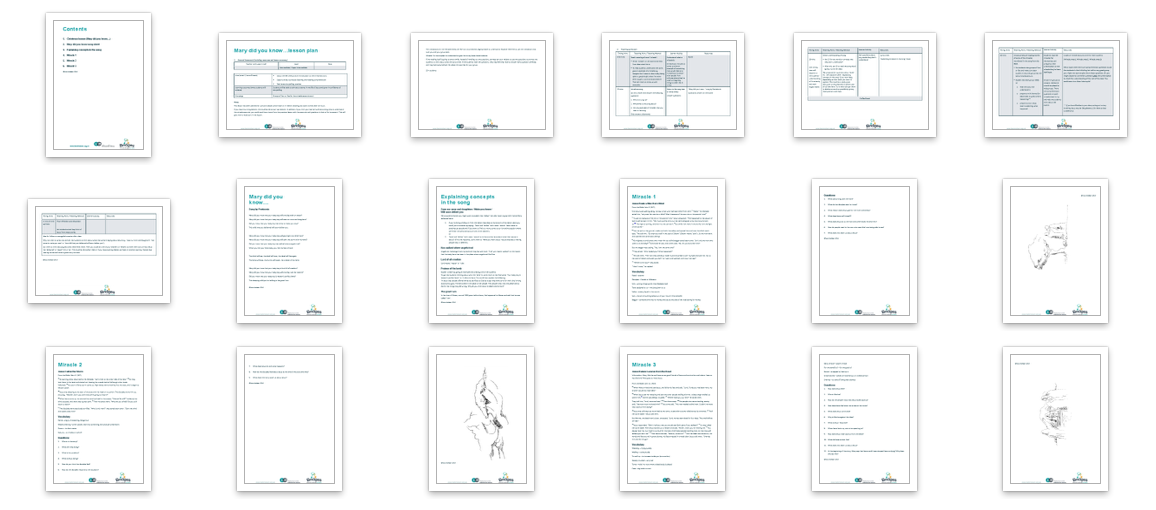 The plan outlines a range of learner activities which provide opportunities for students to practise listening and reading comprehension as well as develop past tense storytelling skills. Resources are also included such as song words, tools for concept checking and teaching material for discussing 3 biblical miracles that are referred to in the song: